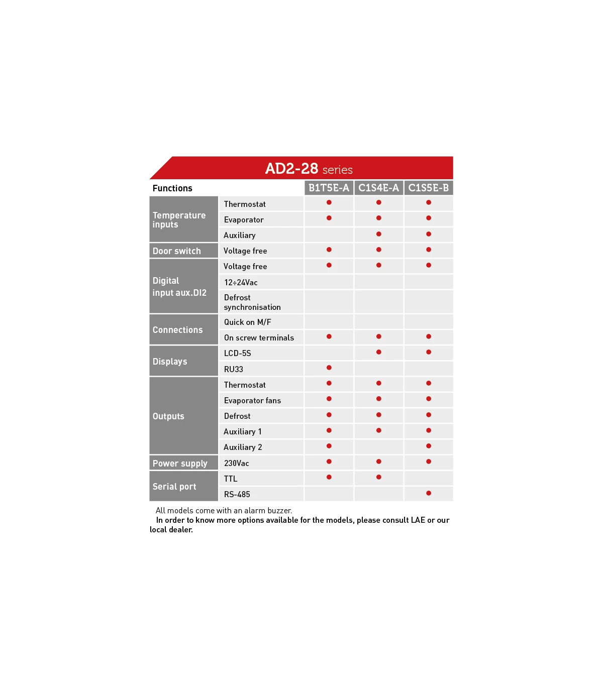 Alarme de temperatură absolută sau relativă, alarmă de deschidere a ușii, alarmă de temperatură/presiune ridicată a condensatorului